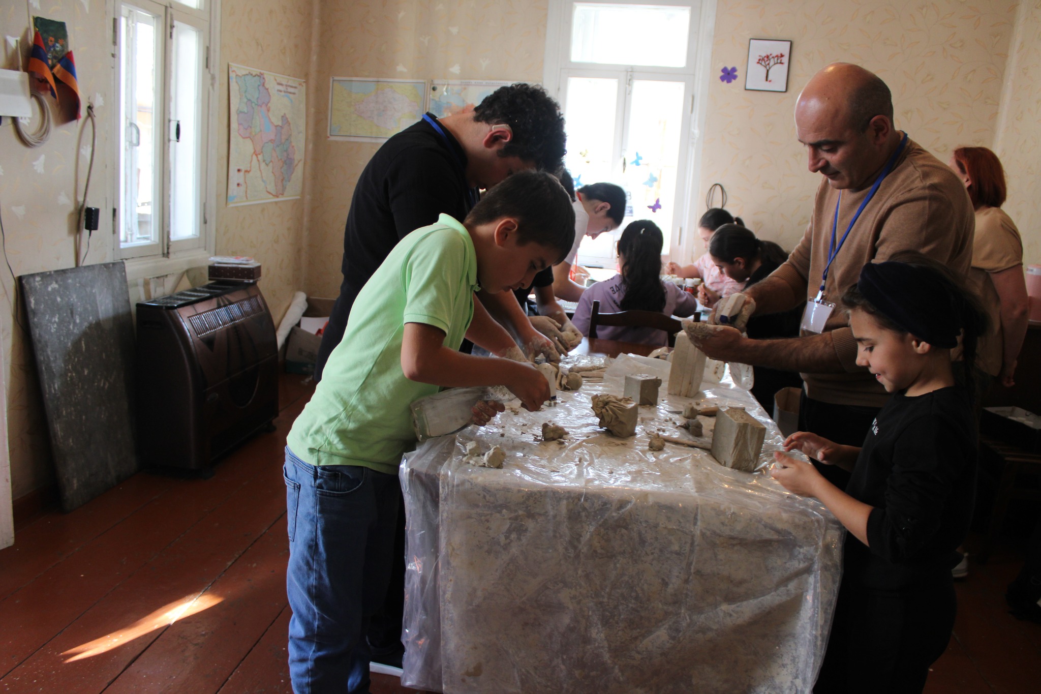 The first stop of the three-day visit was at the youth cultural center in Akhaltsikhe. Educators and talented students from the "Endanik" center enriched master classes in dance, painting, stained glass art, carpet weaving, tapestry weaving, pottery, wool craft, embroidery, quilting, and batik with traditional national songs and dances. These master classes also served as a cultural dialogue for Javakheti Armenian students, providing an excellent opportunity to learn what is not taught at their center.