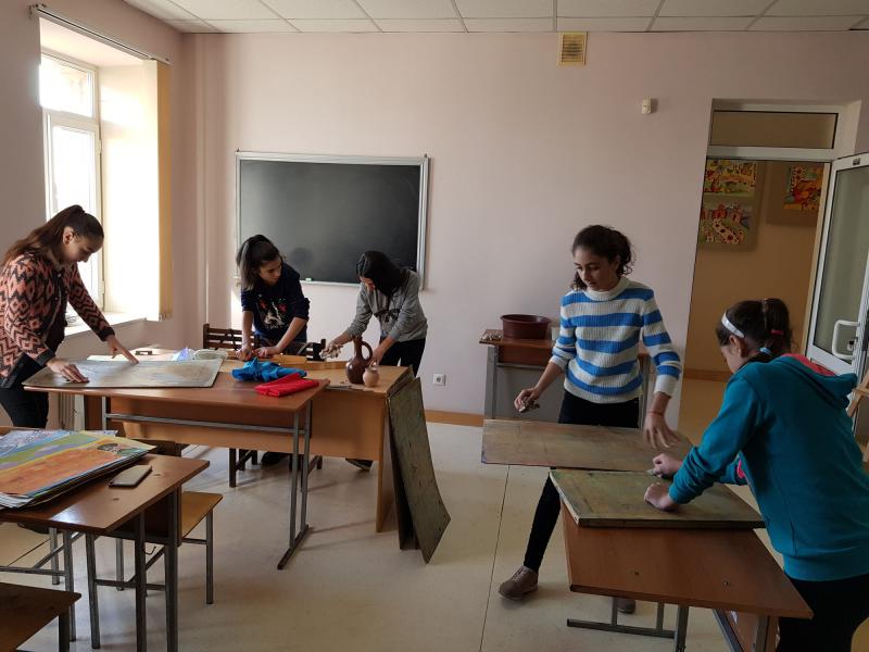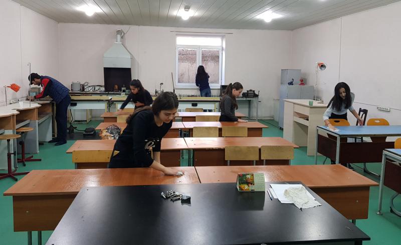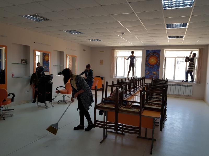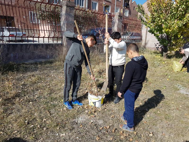Les élèves, les professeurs du centre et les habitants du quartier ont manifesté une participation active aux travaux de nettoyage. On a attribué des tâches et selon les travaux les participants se sont divisés en groupes, on a attribué aux élèves et aux professeurs du matériel nécessaire. Les adolescents ont participé avec plaisir et application aux travaux de nettoyage à l’intérieur et à l’extérieur du centre. Les participants du nettoyage ont fait l’élaboration des arbres et de la terre.