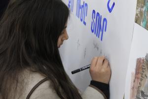 À la fin de l'exposition, les élèves ont dessiné et écrit leurs rêves et leurs souhaits pour une patrie pacifique sur une affiche intitulée "Donne ta force à la patrie".