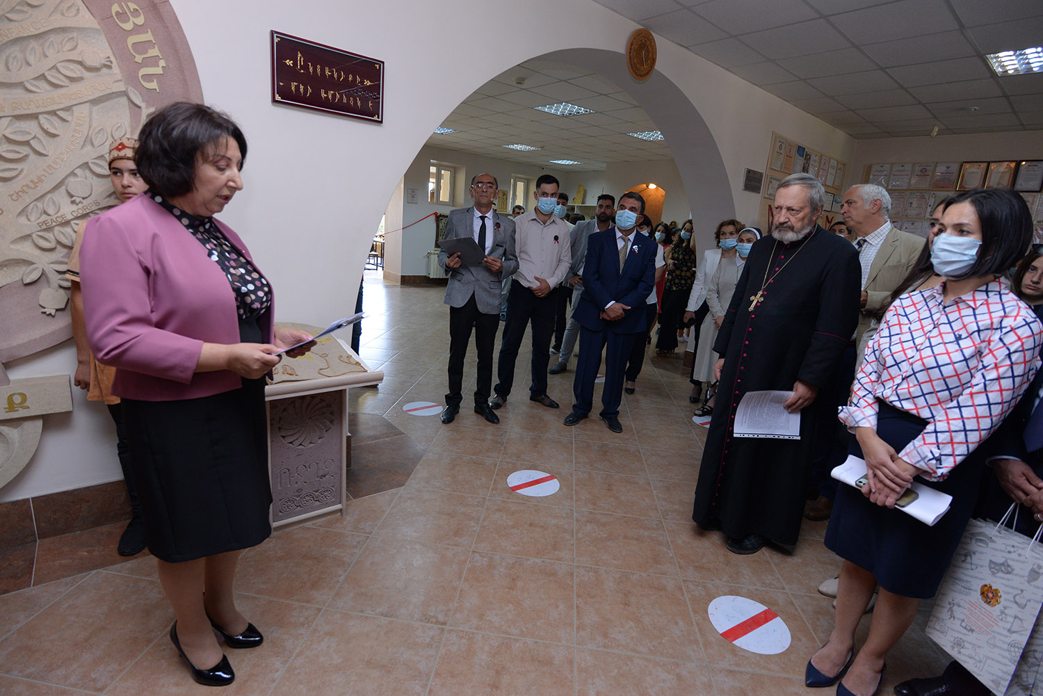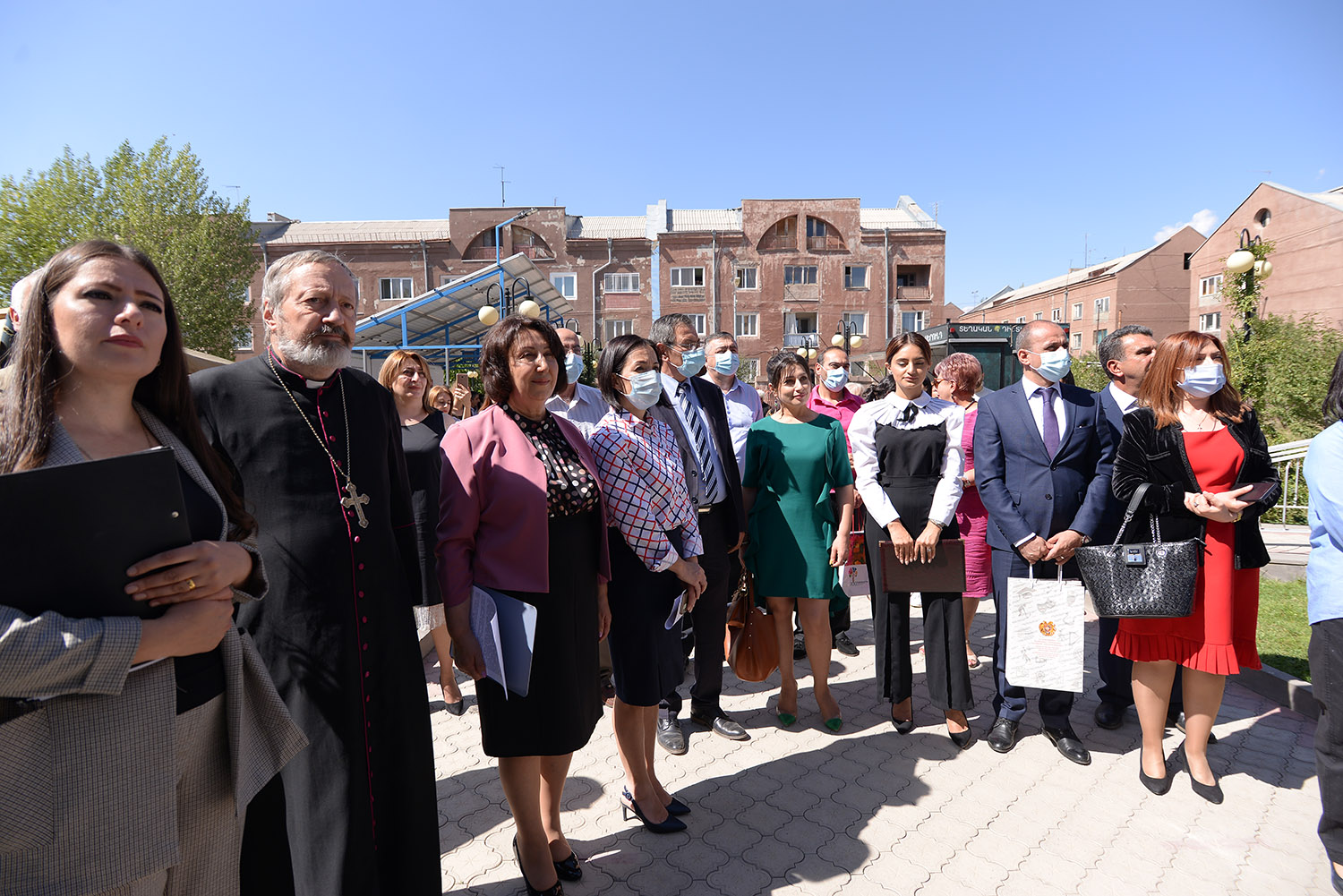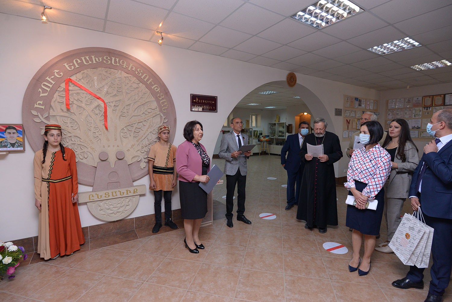 Jeanne Andréassian, vice-ministre de l'Éducation, de la Science, de la Culture et du Sport, des représentants de la ville et des autorités régionales, de nombreux invités de l'étranger: Mgr Pascal Gollnish - Directeur Général de l’organisation "Œuvre d'Orient", Vincent Cayol - directeur des opérations chez l’Œuvre d’Orient, Églantine Gabaix-Hialé - chargée de Mission Œuvre d’Orient, ainsi que les parents et les proches des soldats péris, et des élèves participant à la guerre, étaient présents à la cérémonie d’inauguration.