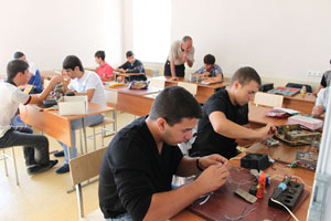 Dans l’atelier de radioélectronique les élèves apprennent à préparer les outils et les matériels correspondants, se servir des dessins et des signes symboliques, assembler, lire de différents shèmes, révéler les causes des défauts et des pannes des équipements: en conservant la technologie définie remplacer les radioélements et les noeuds, vérifier et éprouver le travail des équipements réparés, installer des antennes et régulariser leur travail, assurer le synthèse des équipements qui fonctionnent simultanément, régulariser les régimes optionaux du travail, conserver les règles de sécurité.