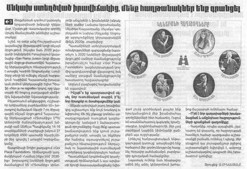 24/09/2020 L'interview de l’hebdomadaire "Chrjapat" avec le directeur du centre créatif pour enfants ʺEntanikʺ Arthur Minassian.