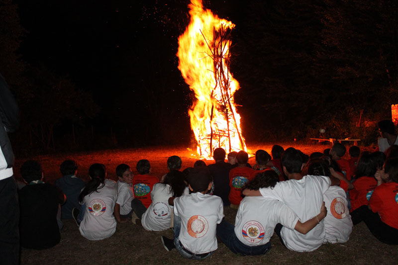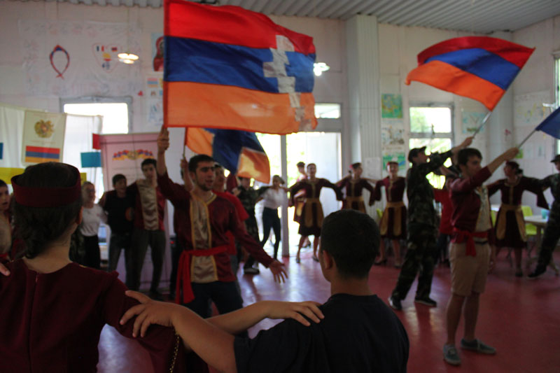 Les campeurs ont formé des cercles par les drapeaux tricolores et se sont produits par la danse.