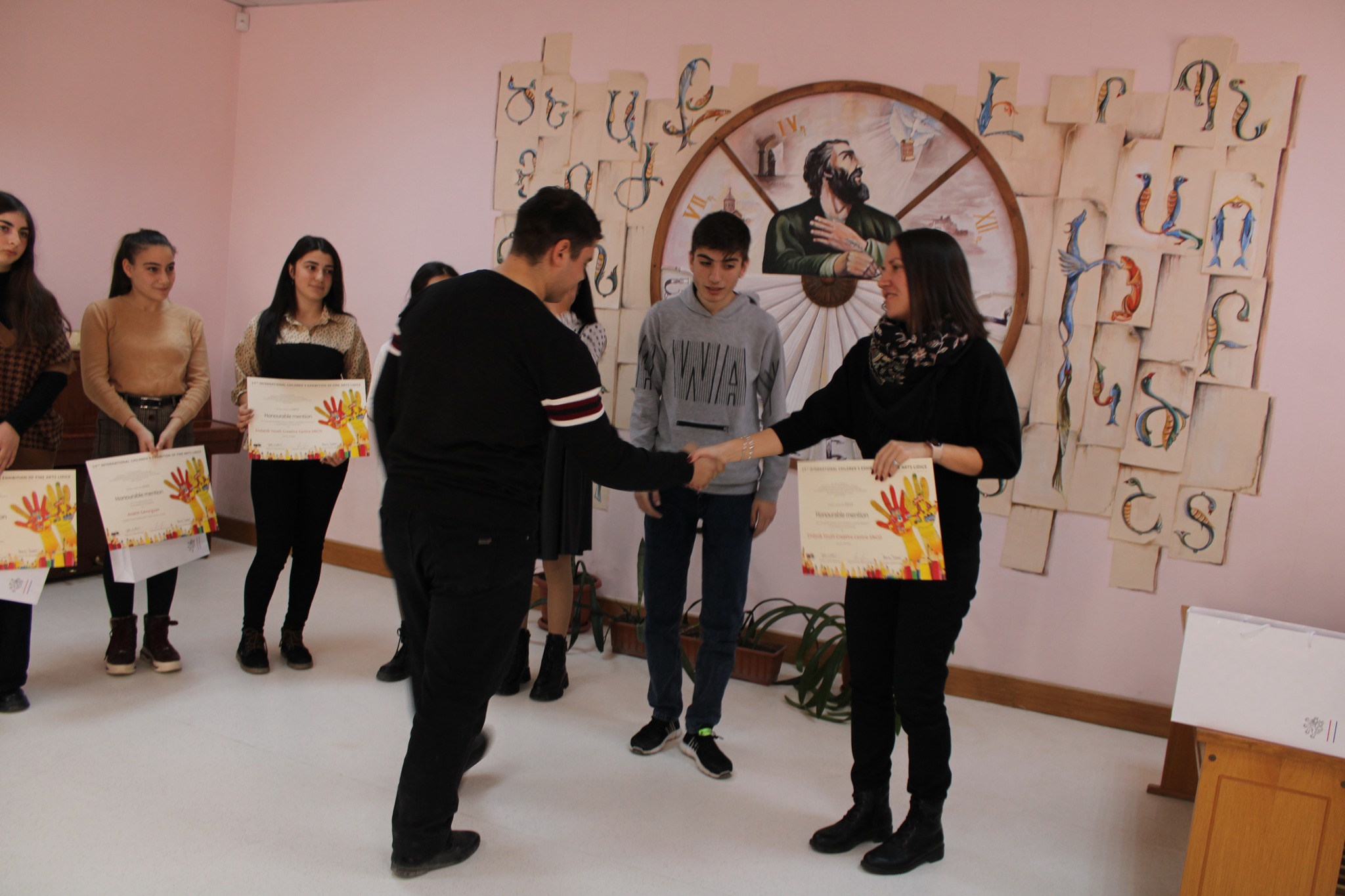 Sabina Novakova, ambassadrice adjointe de la République Tchèque en Arménie, Maria Zalian, représentante de l'ambassade, ont visité le centre créatif pour enfants "Entanik". L'ambassadrice adjointe Sabina Novakova a personnellement remis les cadeaux et certificats aux élèves participant au concours. Ensuite les invités ont visité le centre, ont pris connaissance de la vie culturelle de l'établissement, des travaux manuels des élèves, qui sont exposés dans la salle d'exposition. Ils ont partagé leurs impressions en exprimant leur admiration pour le talent des élèves doués et les programmes multi-contenus du centre. L'ambassadeur adjoint a exhorté les élèves du centre à participer au concours international des beaux-arts annoncé à Lidice l'année prochaine.